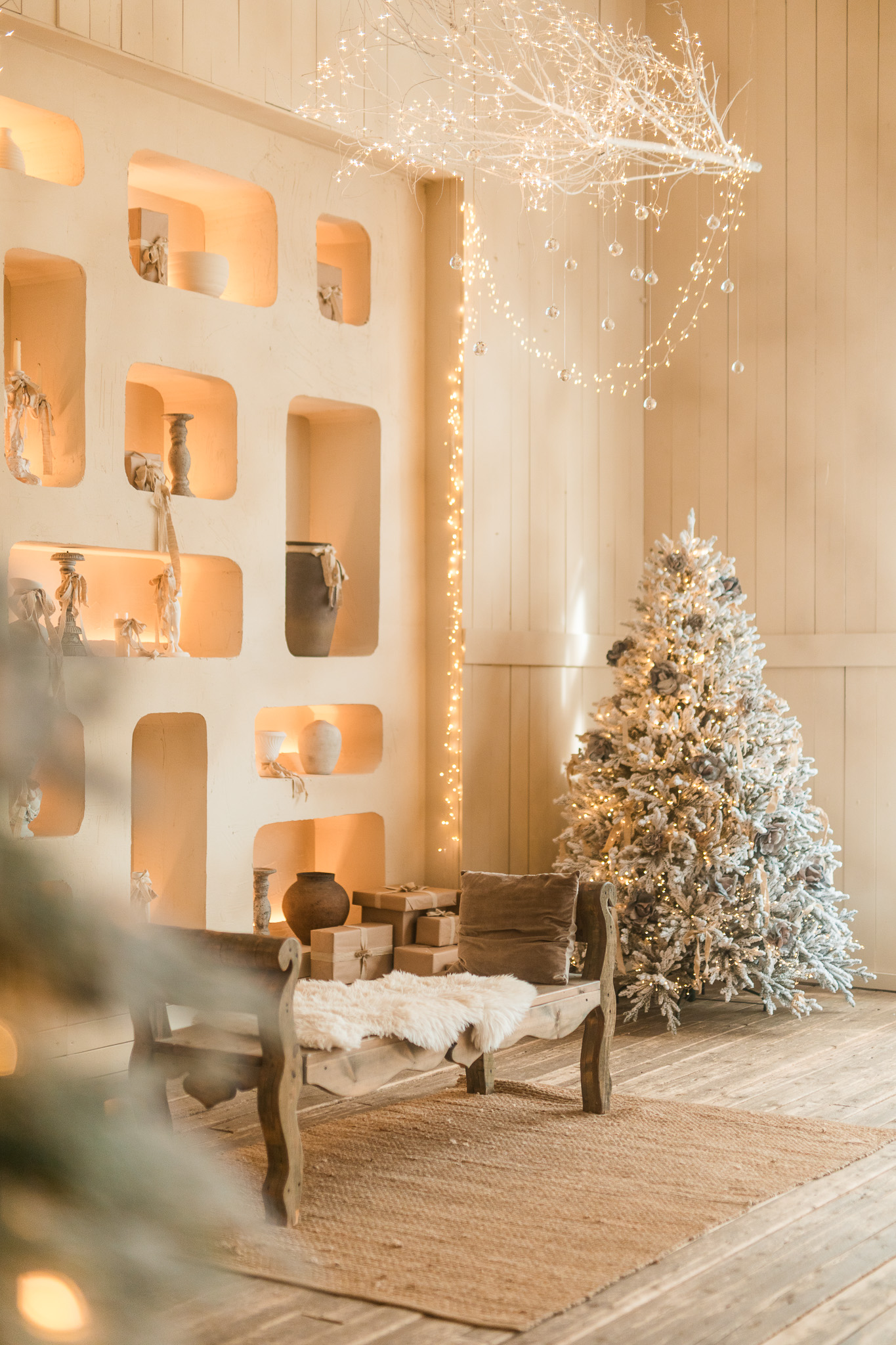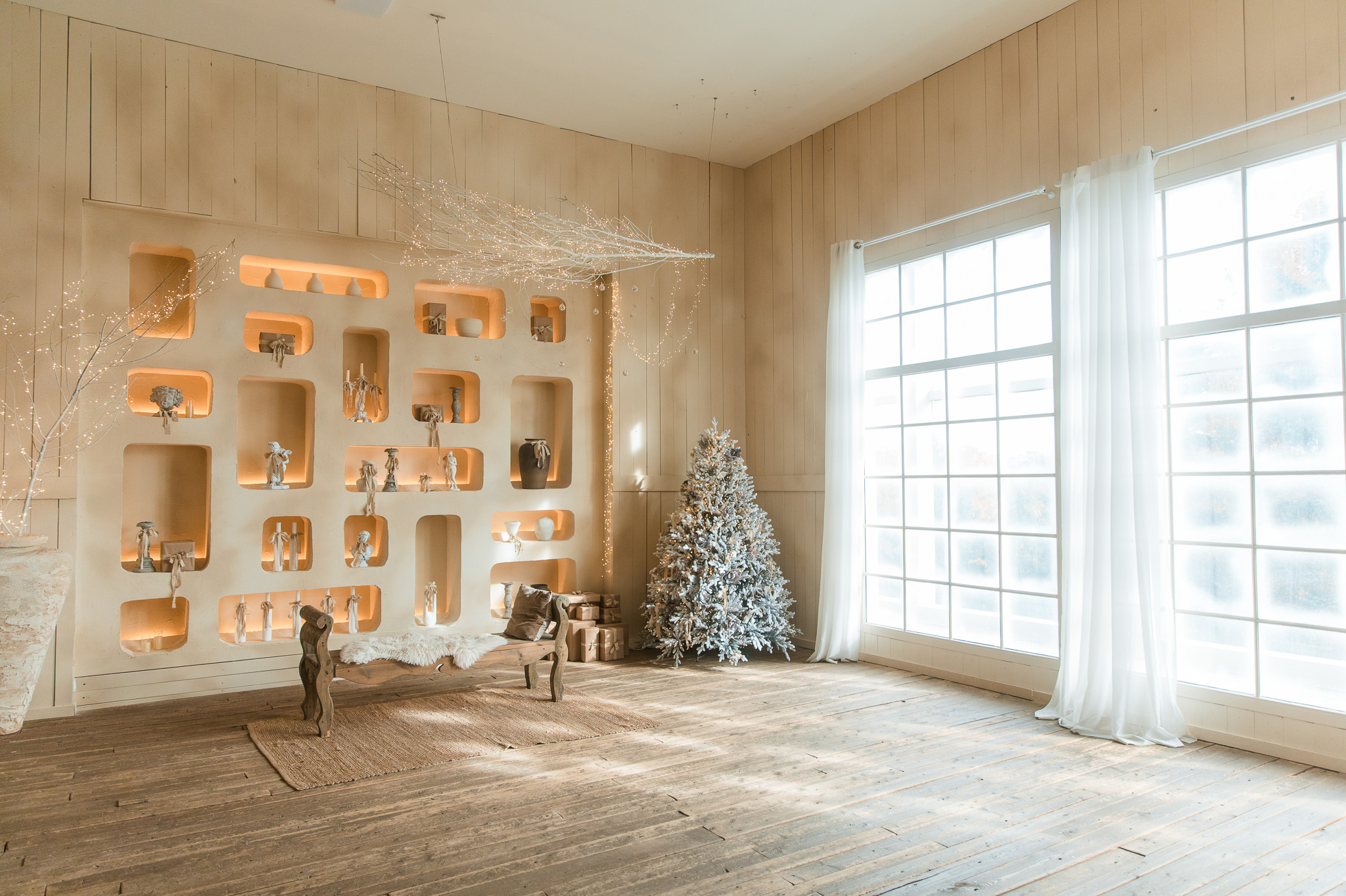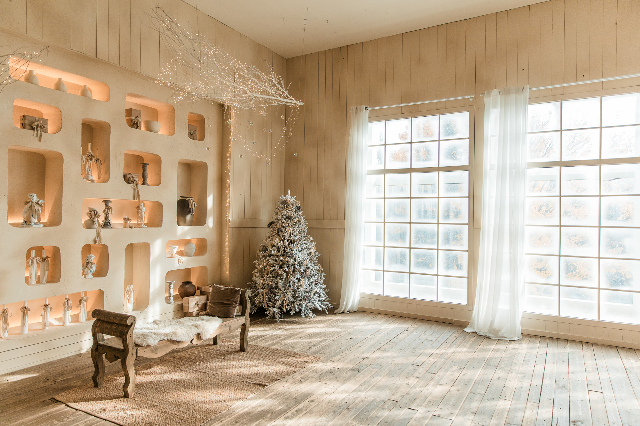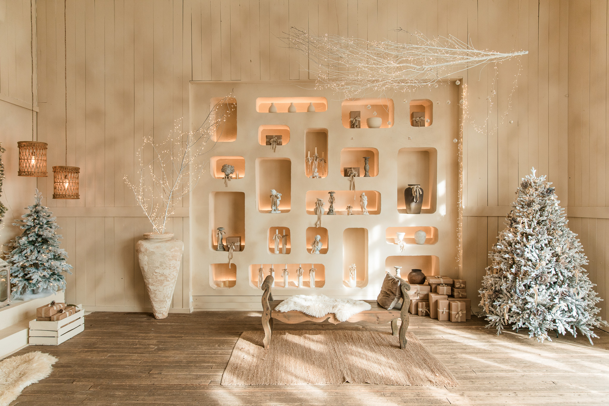 Sala Boho din Studioul ArtStage combină stilul natural și relaxat cu un decor de iarnă elegant. Texturile din lemn, tonurile neutre și accentele sezoniere creează o atmosferă caldă și luminoasă, ideală pentru ședințe foto. Detaliile decorative, lumina naturală și elementele boho rafinate oferă un cadru armonios, echilibrat și plin de farmec.