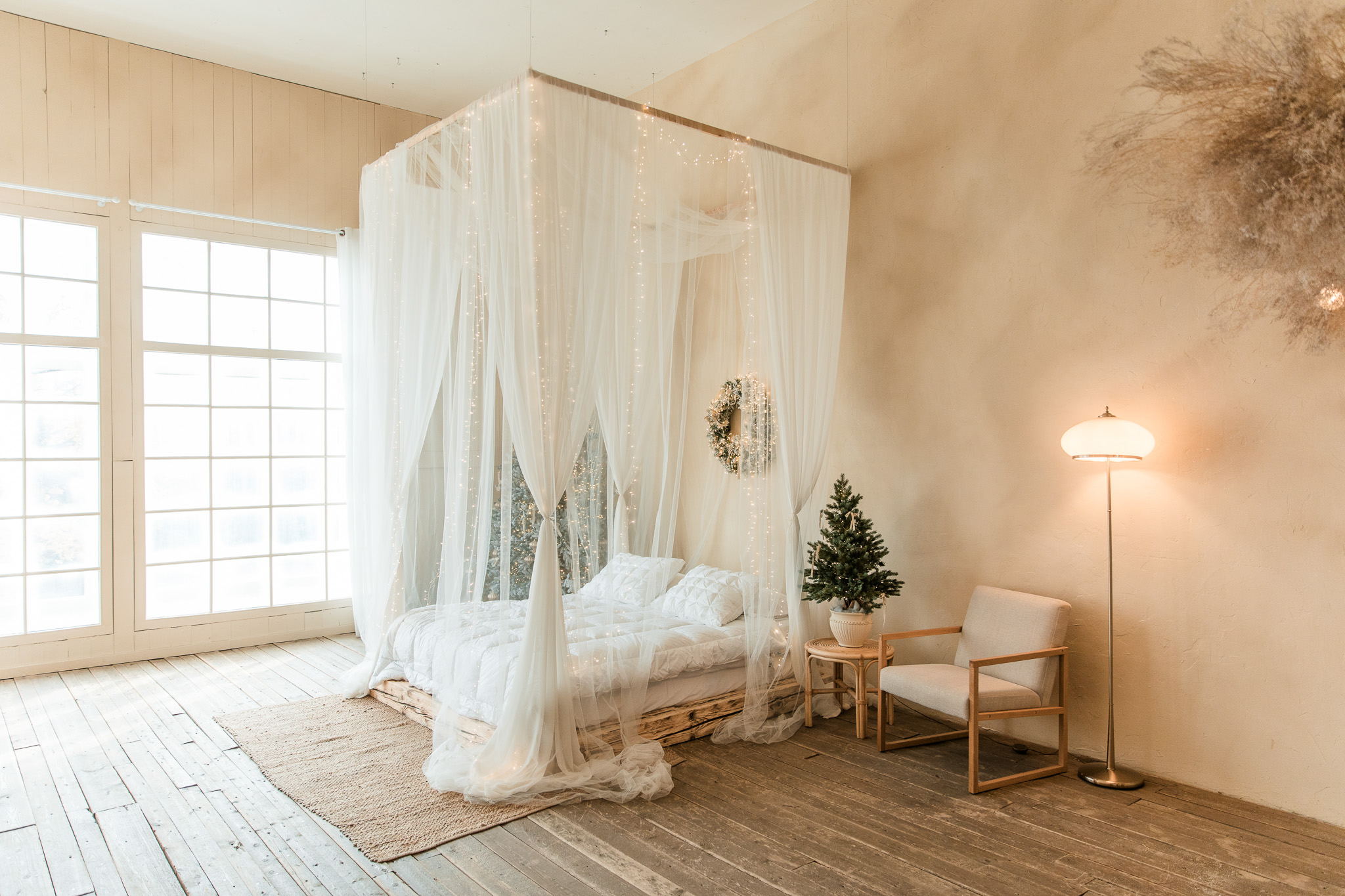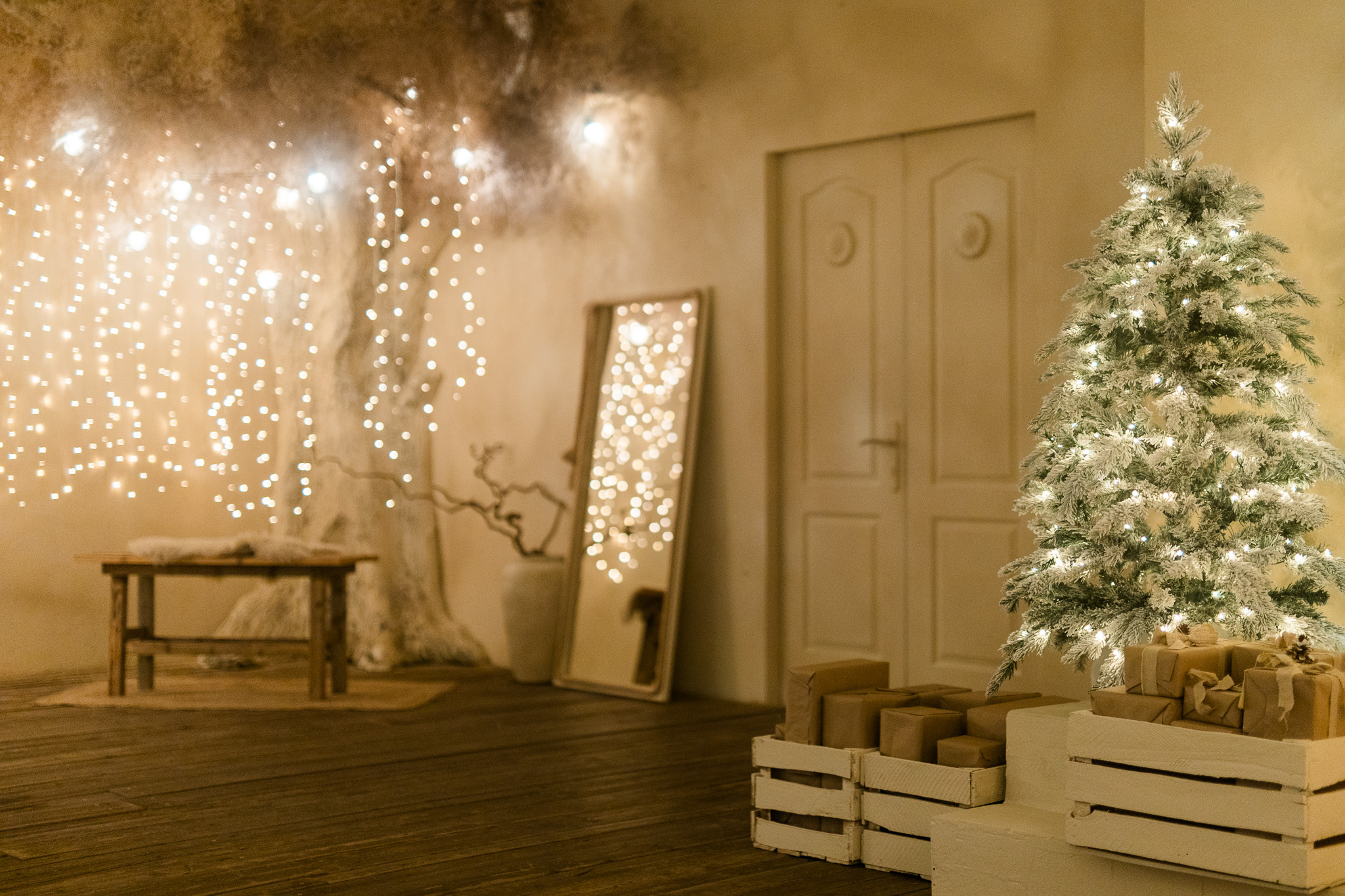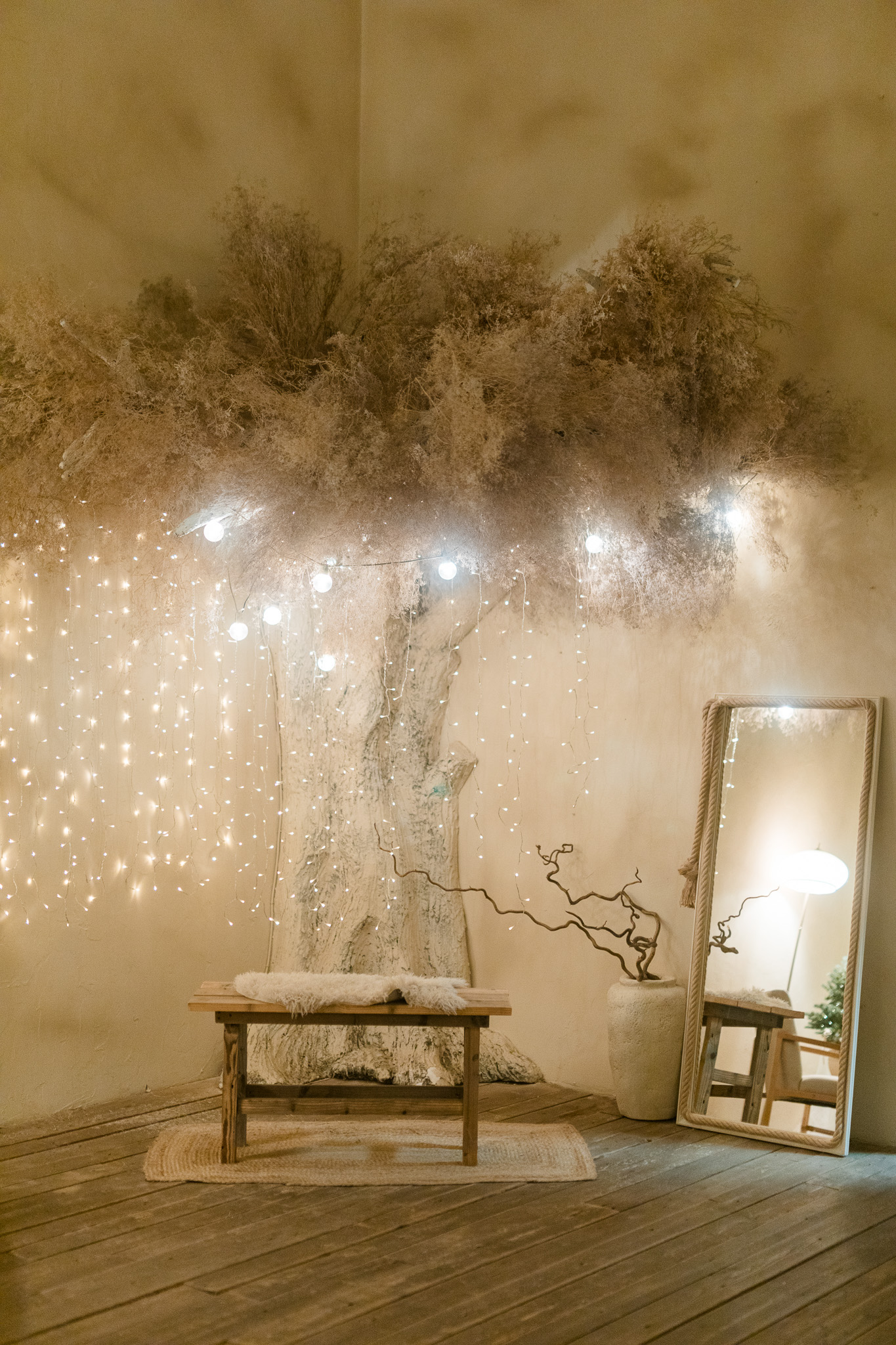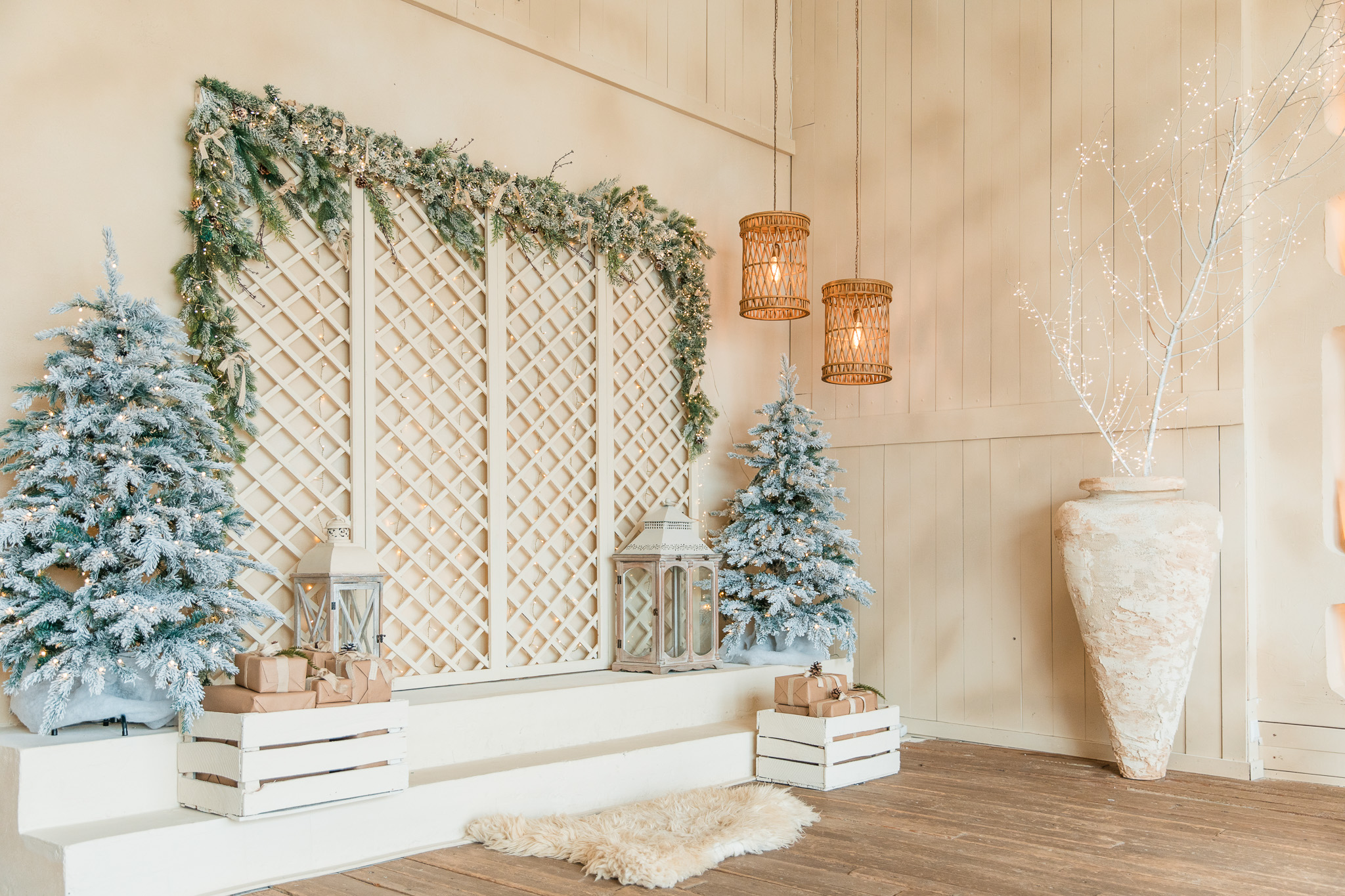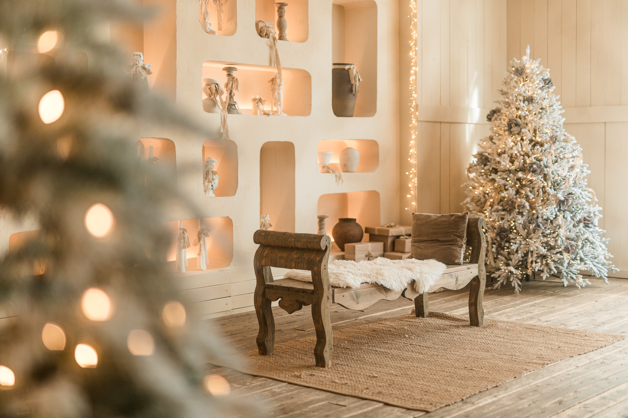 Sala Boho din Studioul ArtStage combină stilul natural și relaxat cu un decor de iarnă elegant. Texturile din lemn, tonurile neutre și accentele sezoniere creează o atmosferă caldă și luminoasă, ideală pentru ședințe foto. Detaliile decorative, lumina naturală și elementele boho rafinate oferă un cadru armonios, echilibrat și plin de farmec.