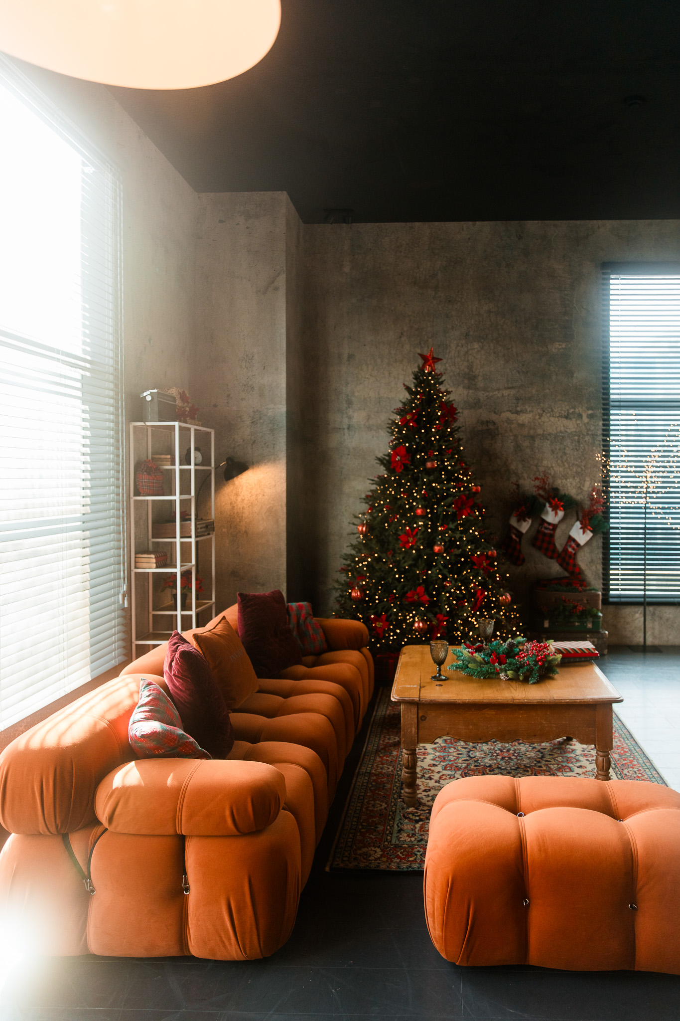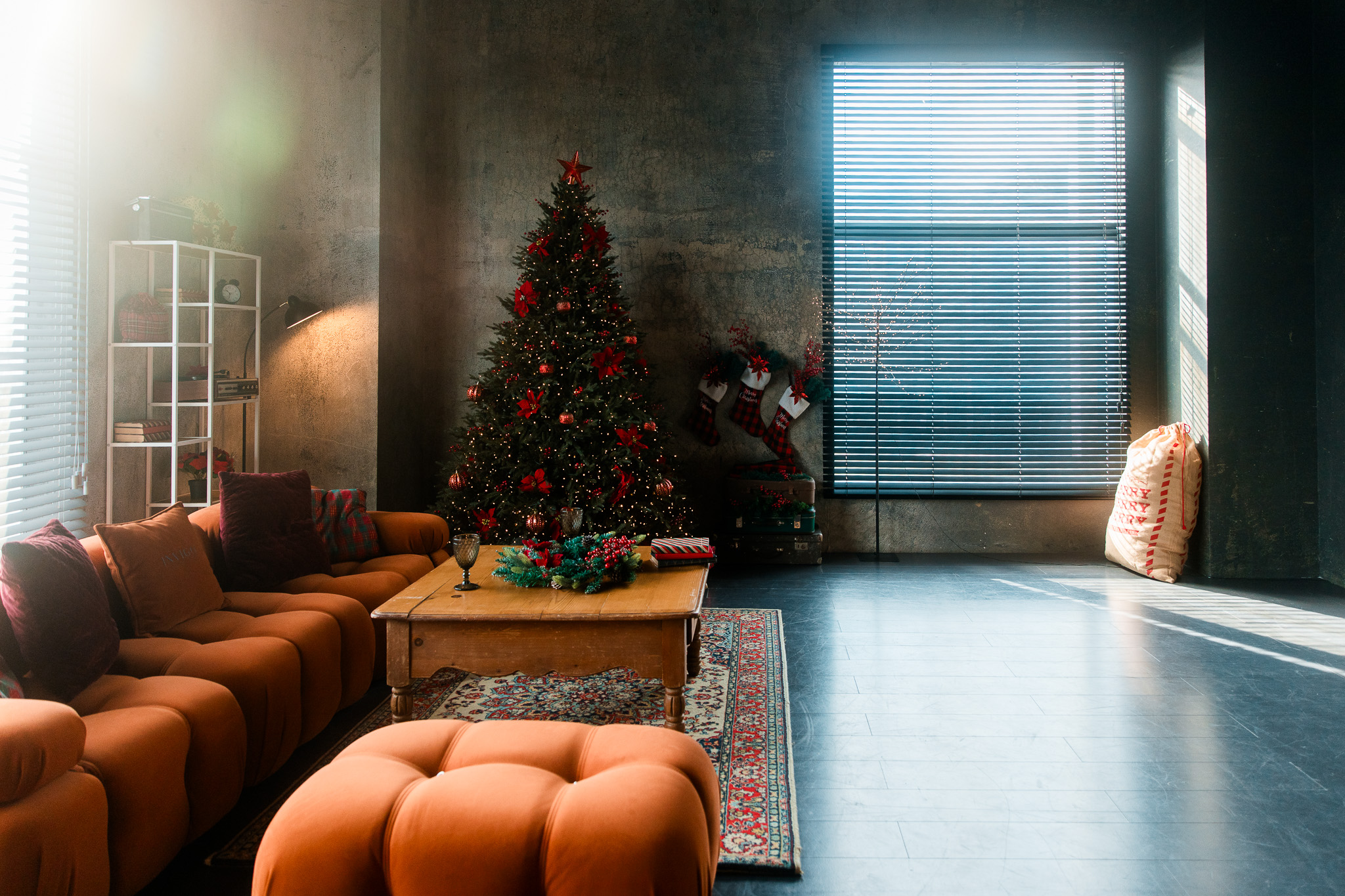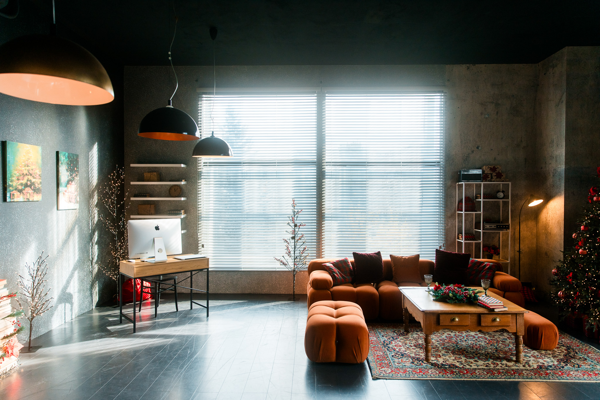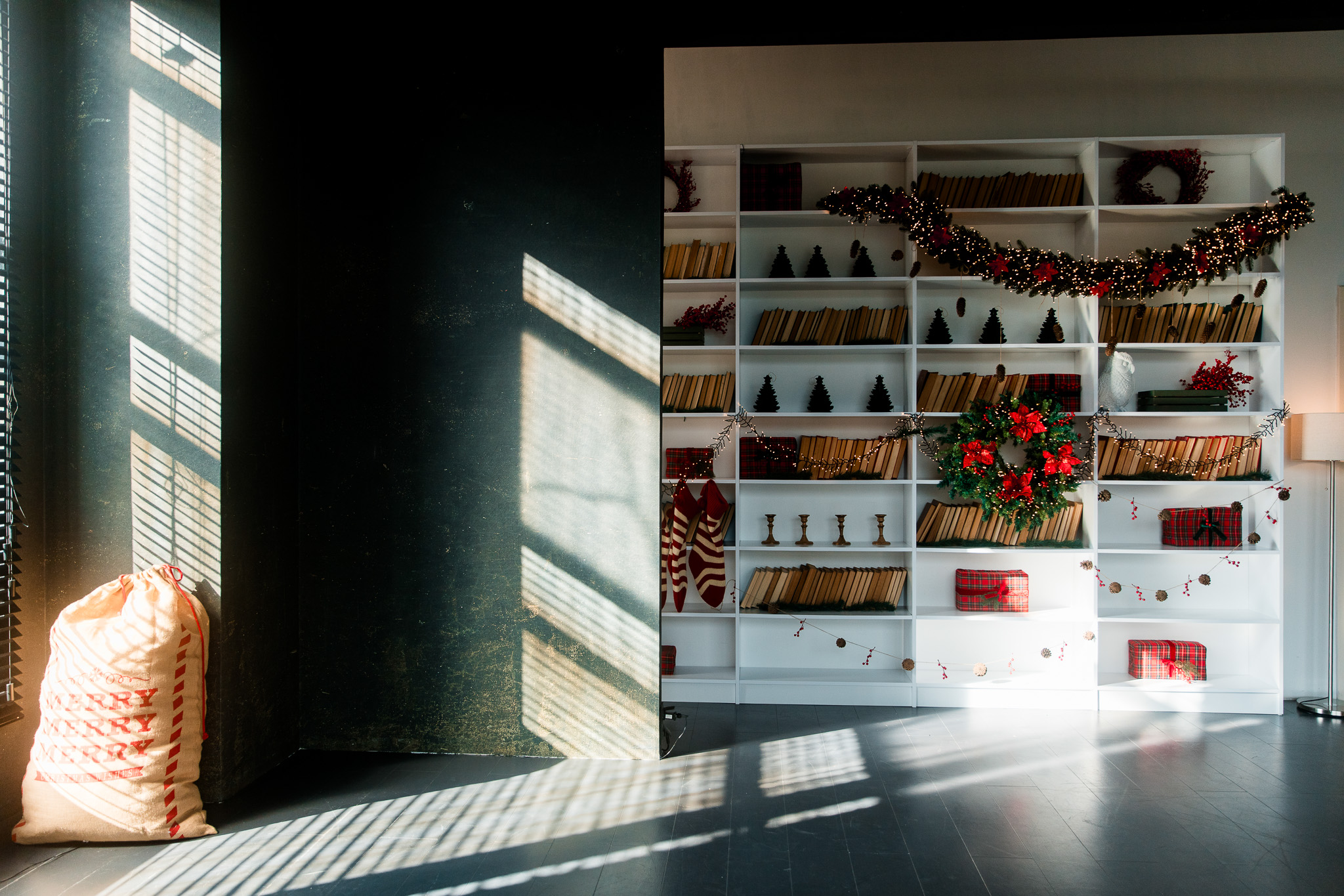 Sala Office din Studioul ArtStage s-a transformat într-un apartament în stil minimalist loft, cu un aer de iarnă care aduce rafinament și căldură. Accentele roșii contrastează plăcut cu pereții în tonuri închise, iar ferestrele mari cu jaluzele creează jocuri de lumină spectaculoase — un decor perfect pentru fotografii de sezon.