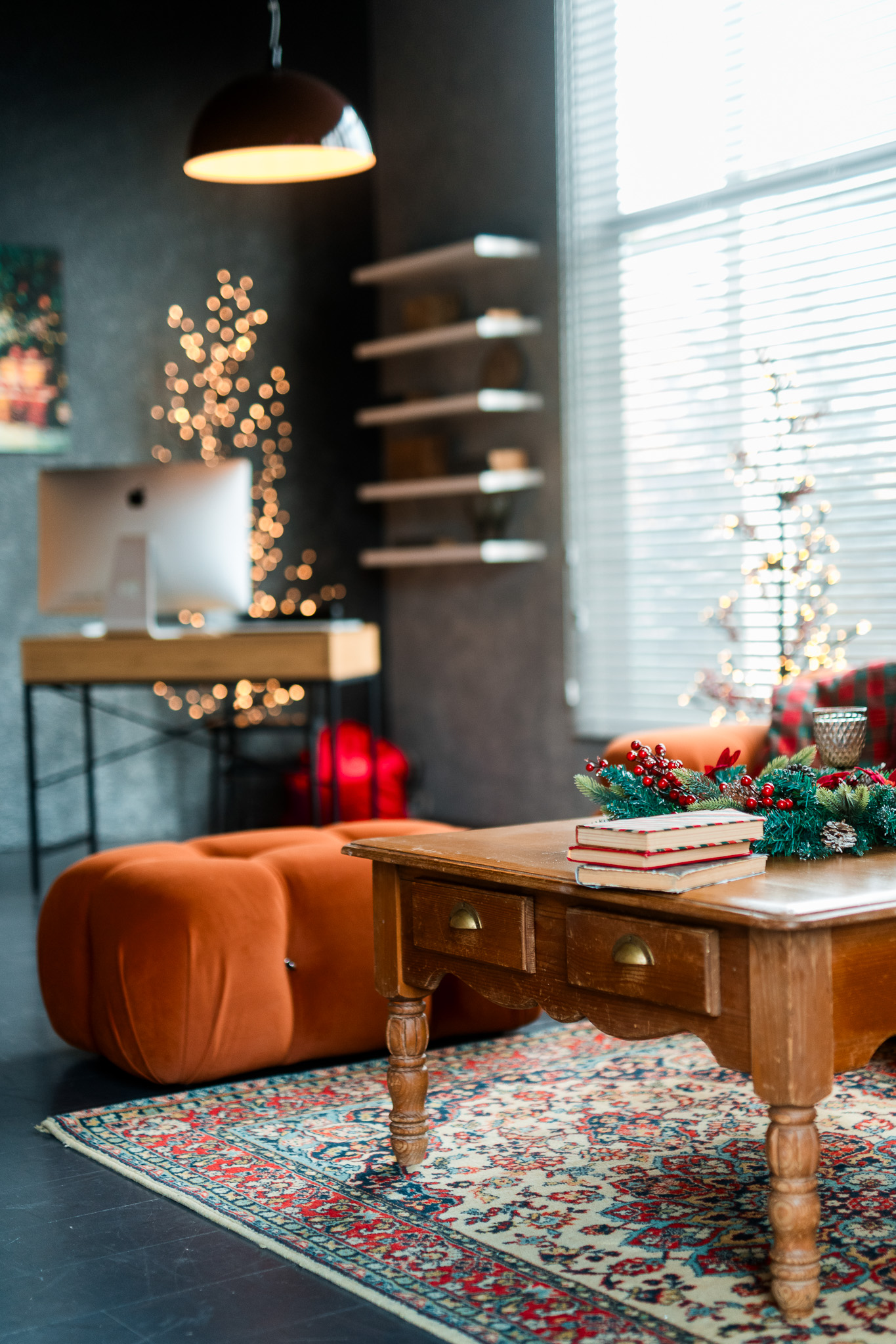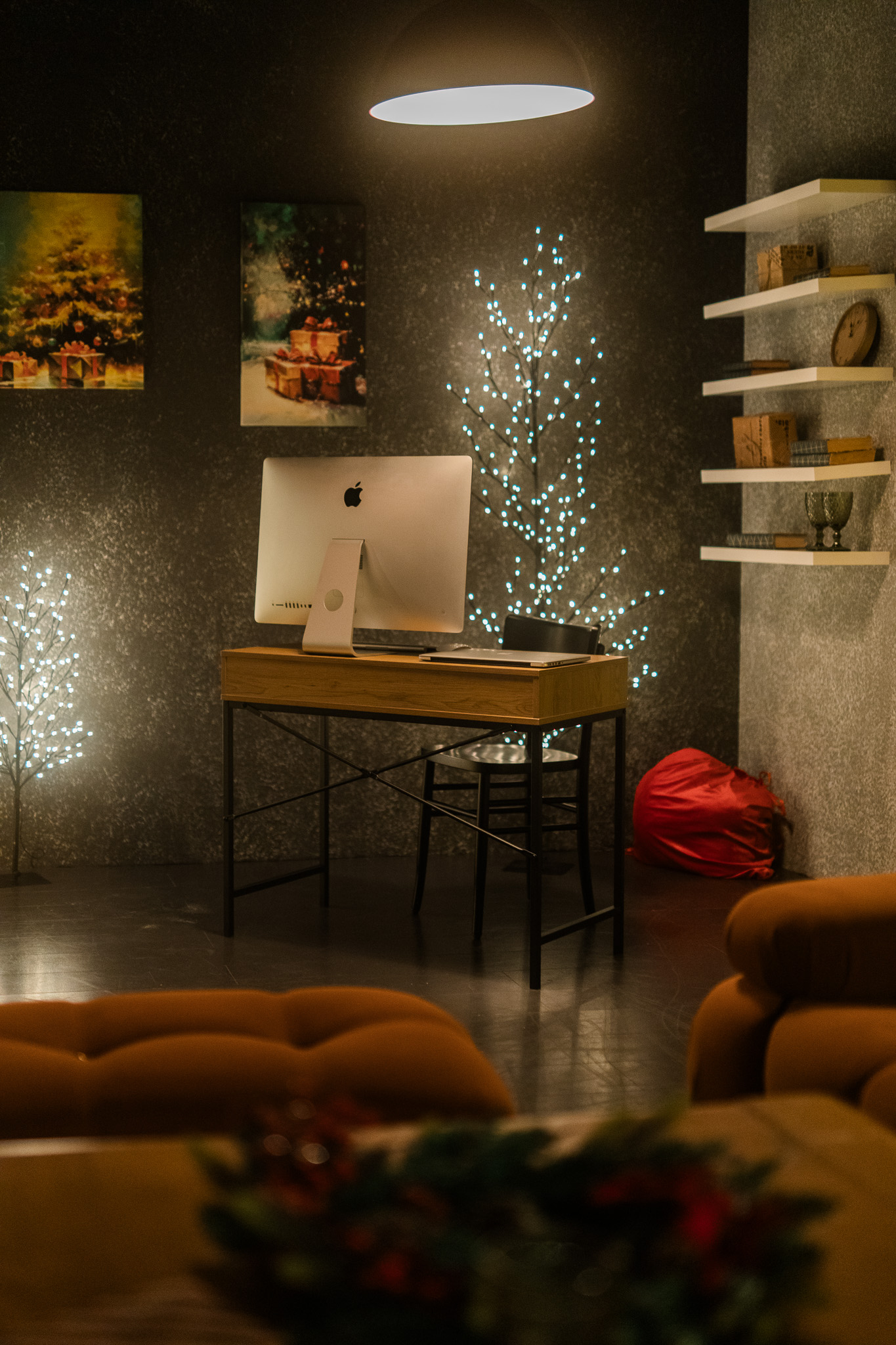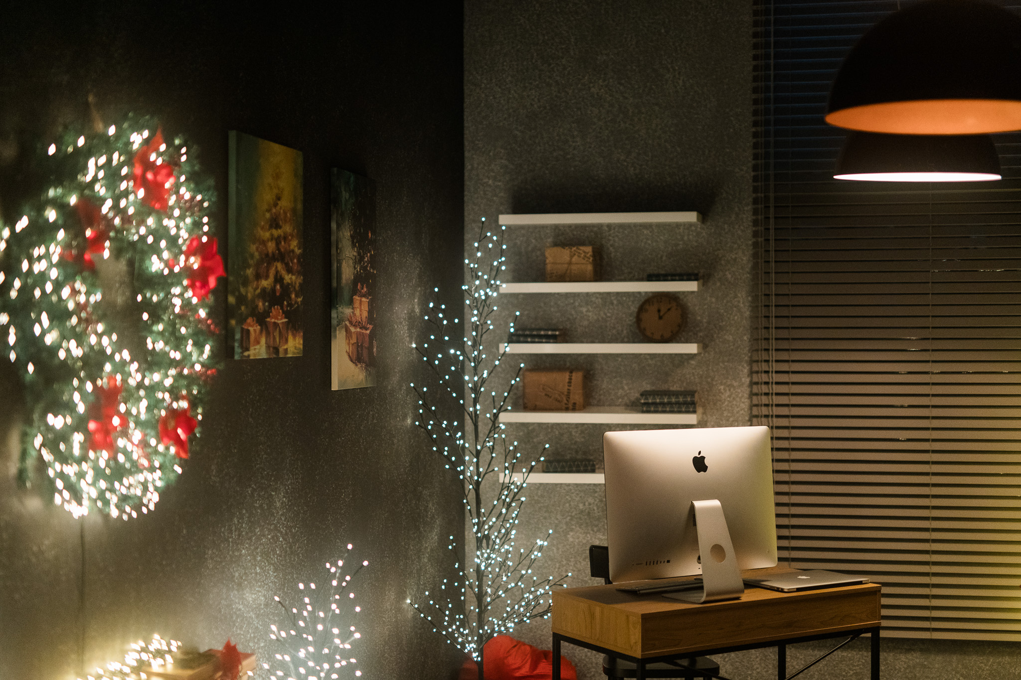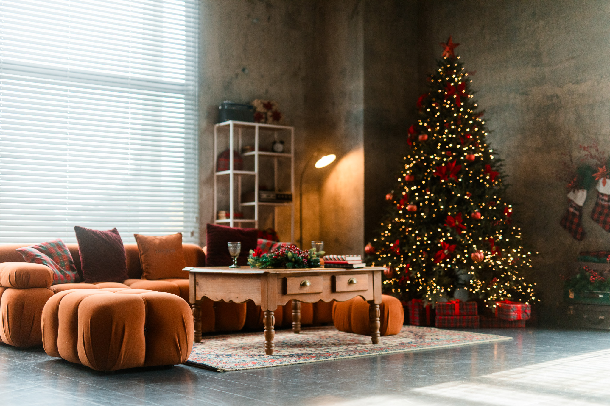 Sala Office din Studioul ArtStage s-a transformat într-un apartament în stil minimalist loft, cu un aer de iarnă care aduce rafinament și căldură. Accentele roșii contrastează plăcut cu pereții în tonuri închise, iar ferestrele mari cu jaluzele creează jocuri de lumină spectaculoase — un decor perfect pentru fotografii de sezon.